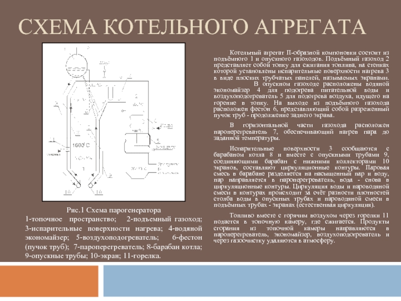 1-топочное пространство;  2-подъемный газоход; 3-испарительные поверхности нагрева; 4-водяной экономайзер; 5-воздухоподогреватель; 6-фестон (пучок труб); 7-пароперегреватель; 8-барабан котла; 9-опускные трубы; 10-экран; 11-горелка.