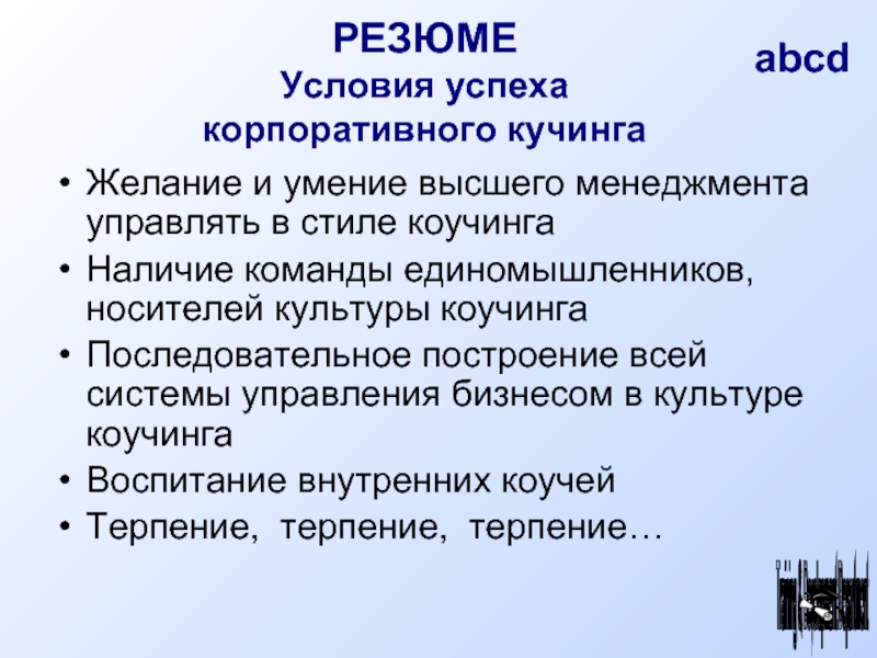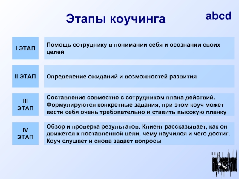 Обзор и проверка результатов. Клиент рассказывает, как он движется к поставленной цели, чему научился и чего достиг. Коуч слушает и снова задает вопросы