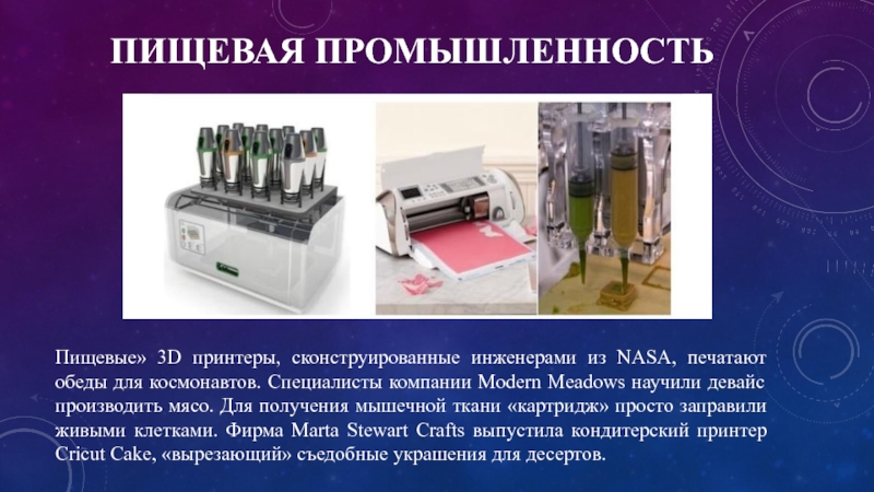 для космонавтов. Специалисты компании Modern Meadows научили девайс производить мясо. Для получения мышечной ткани «картридж» просто заправили живыми клетками. Фирма Marta Stewart Crafts выпустила кондитерский принтер Cricut Cake, «вырезающий» съедобные украшения для десертов.