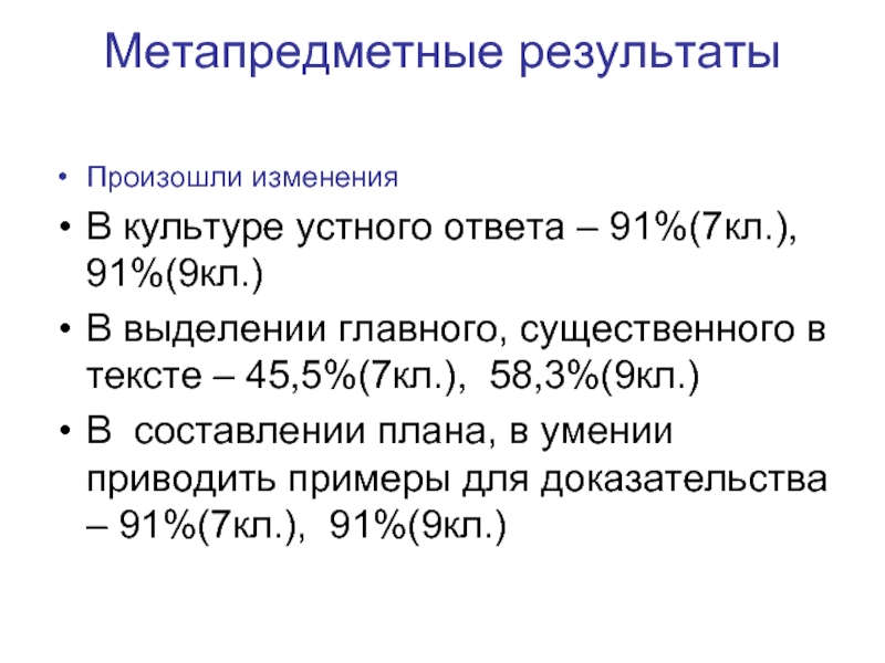 В составлении плана, в умении приводить примеры для доказательства – 91%(7кл.), 91%(9кл.)