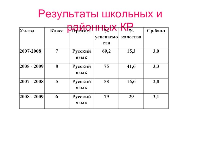 Средний балл итоговых школьных и районных КР тоже повысился с 3,1 до 4,0 баллов в 6кл., с 3,1 до 3,3 балла в 8 кл. (2008-2009уч. г.)