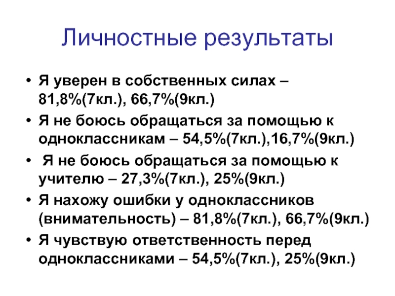 Я уверен в собственных силах – 81,8%(7кл.), 66,7%(9кл.)