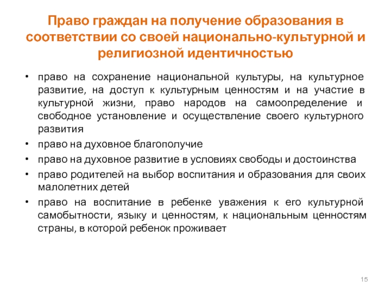 Слайд 15Право граждан на получение образования в соответствии со своей национально-культурной и