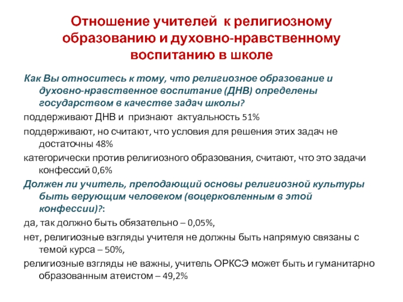 Слайд 5Отношение учителей к религиозному образованию и духовно-нравственному воспитанию в школе