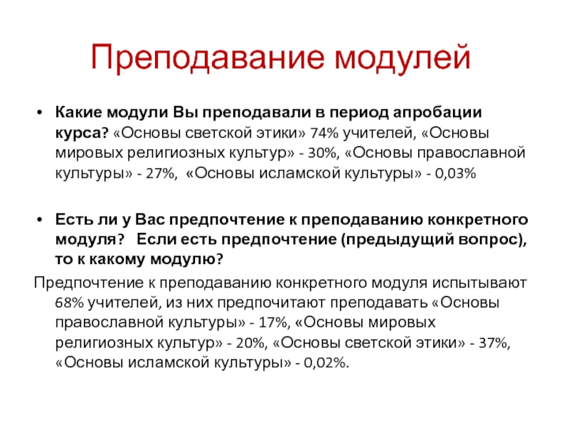 Предпочтение к преподаванию конкретного модуля испытывают 68% учителей, из них предпочитают преподавать «Основы православной культуры» - 17%, «Основы мировых религиозных культур» - 20%, «Основы светской этики» - 37%, «Основы исламской культуры» - 0,02%.