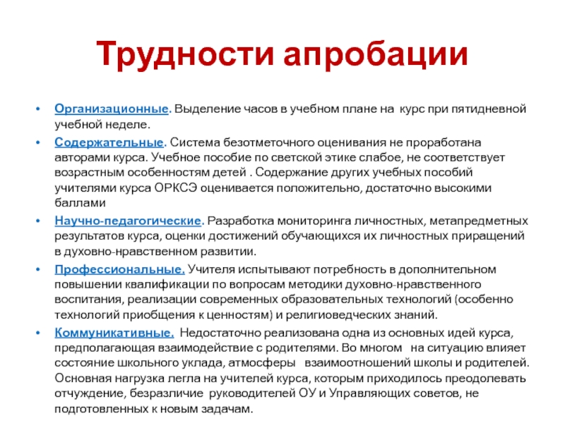 Содержательные. Система безотметочного оценивания не проработана авторами курса. Учебное пособие по светской этике слабое, не соответствует возрастным особенностям детей . Содержание других учебных пособий учителями курса ОРКСЭ оценивается положительно, достаточно высокими баллами