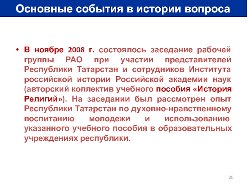 группы РАО при участии представителей Республики Татарстан и сотрудников Института российской истории Российской академии наук (авторский коллектив учебного пособия «История Религий»). На заседании был рассмотрен опыт Республики Татарстан по духовно-нравственному воспитанию молодежи и использованию указанного учебного пособия в образовательных учреждениях республики.