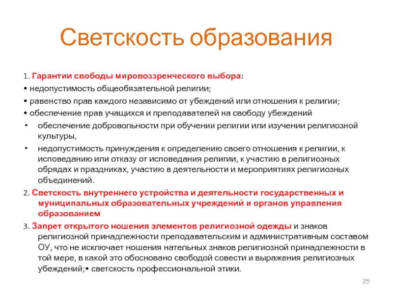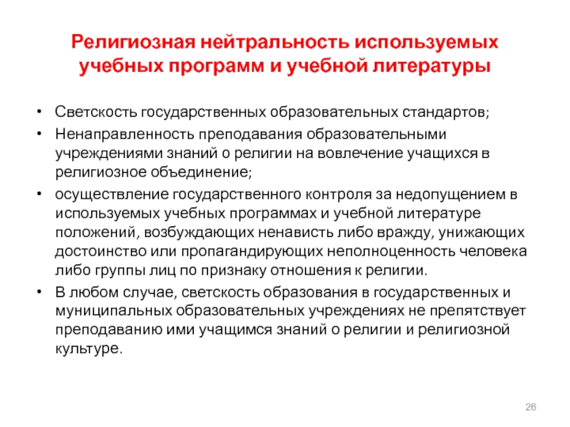Слайд 26Религиозная нейтральность используемых учебных программ и учебной литературы