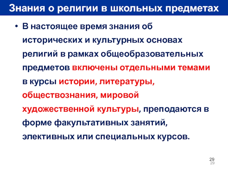 исторических и культурных основах религий в рамках общеобразовательных предметов включены отдельными темами в курсы истории, литературы, обществознания, мировой художественной культуры, преподаются в форме факультативных занятий, элективных или специальных курсов.