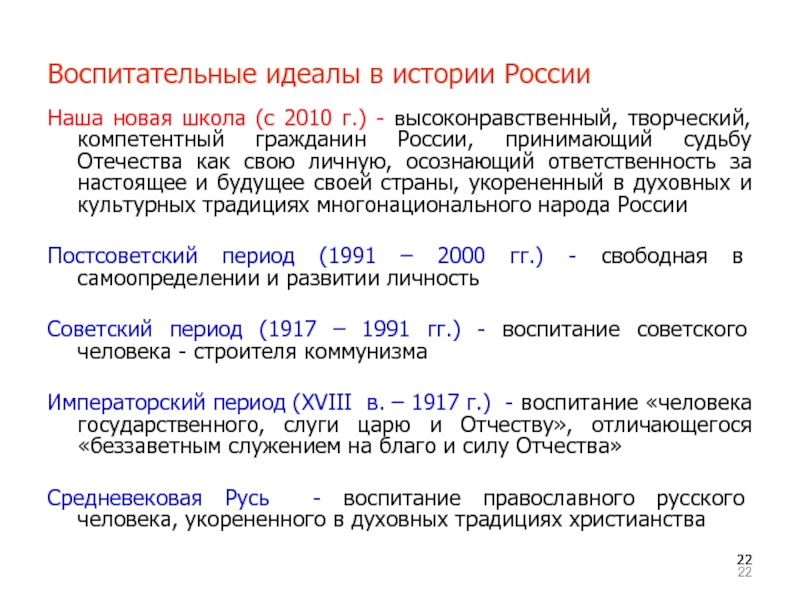 Современный национальный воспитательный идеал - высоконравственный, творческий, компетентный гражданин России, принимающий судьбу Отечества как свою личную, осознающий ответственность за настоящее и будущее своей страны, укорененный в духовных и культурных традициях многонационального народа России