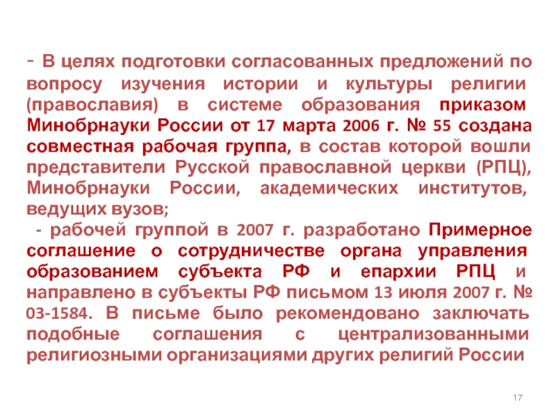 истории и культуры религии (православия) в системе образования приказом Минобрнауки России от 17 марта 2006 г. № 55 создана совместная рабочая группа, в состав которой вошли представители Русской православной церкви (РПЦ), Минобрнауки России, академических институтов, ведущих вузов;