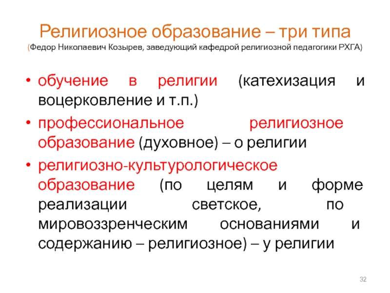 Слайд 32Религиозное образование – три типа (Федор Николаевич Козырев, заведующий кафедрой религиозной