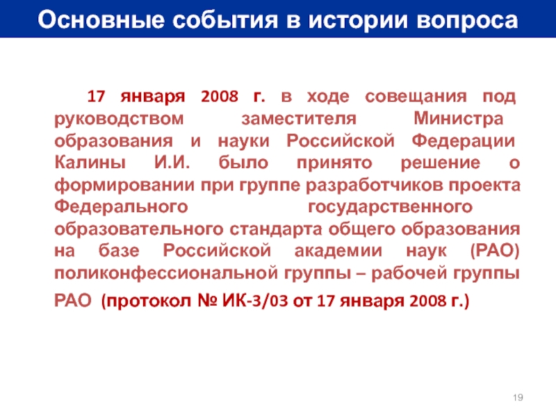 г. в ходе совещания под руководством заместителя Министра образования и науки Российской Федерации Калины И.И. было принято решение о формировании при группе разработчиков проекта Федерального государственного образовательного стандарта общего образования на базе Российской академии наук (РАО) поликонфессиональной группы – рабочей группы РАО (протокол № ИК-3/03 от 17 января 2008 г.)