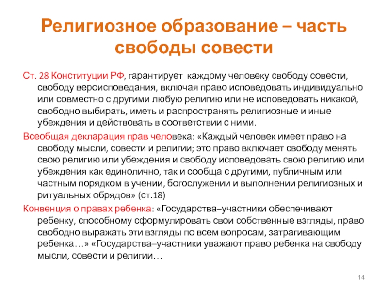 человеку свободу совести, свободу вероисповедания, включая право исповедовать индивидуально или совместно с другими любую религию или не исповедовать никакой, свободно выбирать, иметь и распространять религиозные и иные убеждения и действовать в соответствии с ними.