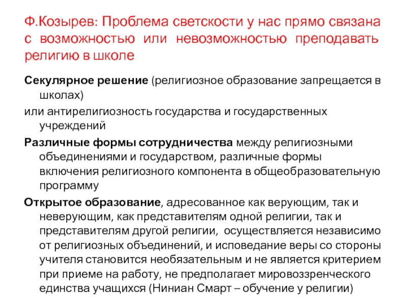 Слайд 27Ф.Козырев: Проблема светскости у нас прямо связана с возможностью или невозможностью