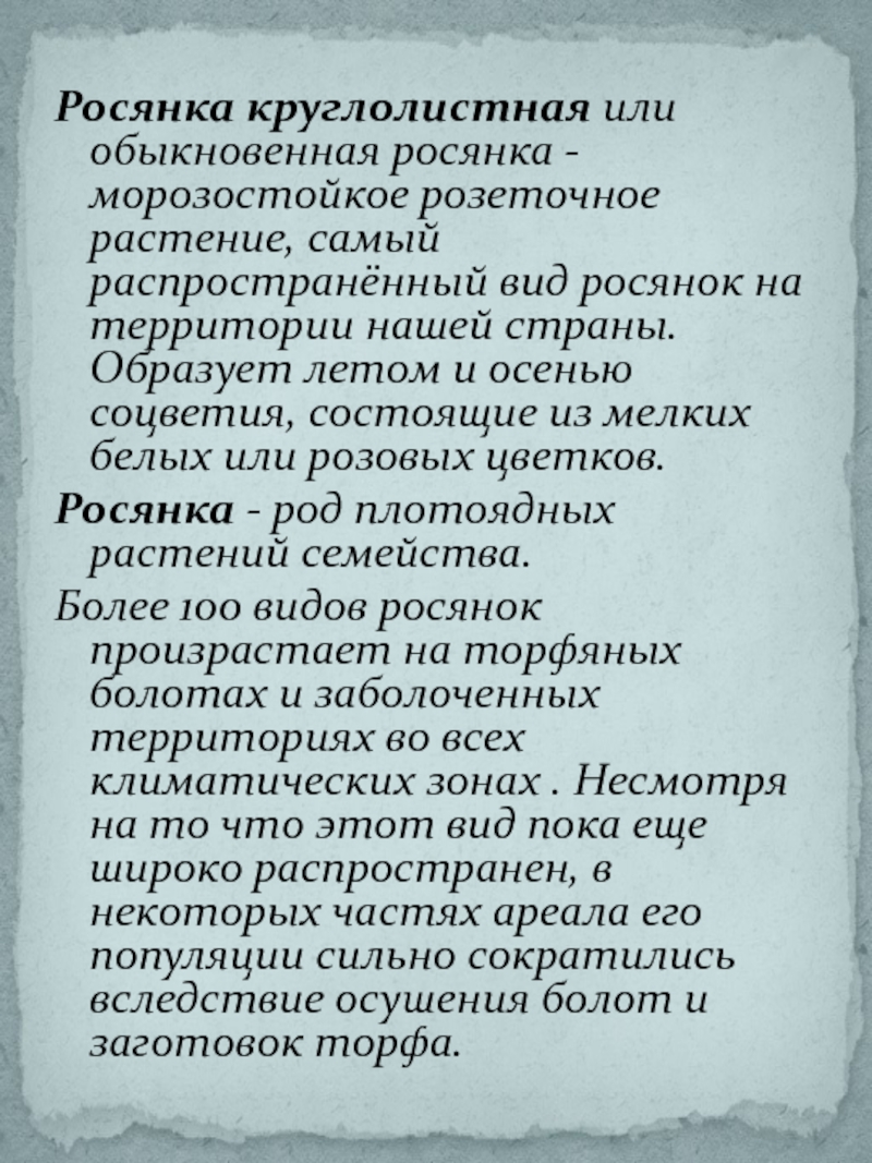 вид росянок на территории нашей страны. Образует летом и осенью соцветия, состоящие из мелких белых или розовых цветков.