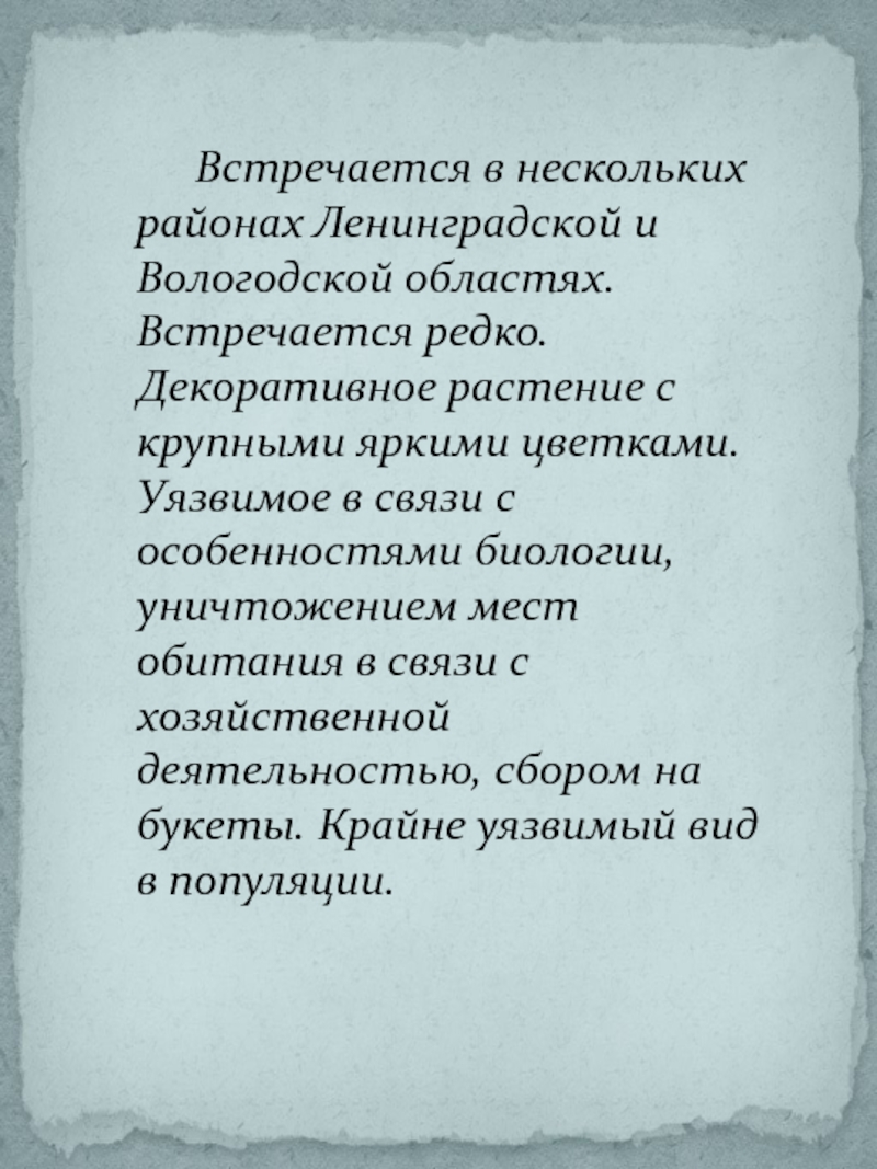 Слайд 25 Встречается в нескольких районах Ленинградской и Вологодской областях.