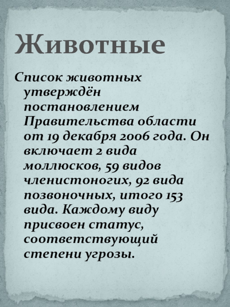 Слайд 33Список животных утверждён постановлением Правительства области от 19 декабря 2006 года.