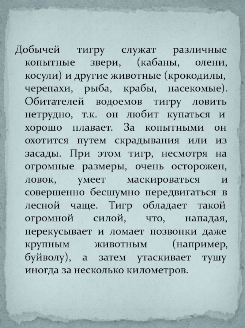 животные (крокодилы, черепахи, рыба, крабы, насекомые). Обитателей водоемов тигру ловить нетрудно, т.к. он любит купаться и хорошо плавает. За копытными он охотится путем скрадывания или из засады. При этом тигр, несмотря на огромные размеры, очень осторожен, ловок, умеет маскироваться и совершенно бесшумно передвигаться в лесной чаще. Тигр обладает такой огромной силой, что, нападая, перекусывает и ломает позвонки даже крупным животным (например, буйволу), а затем утаскивает тушу иногда за несколько километров.