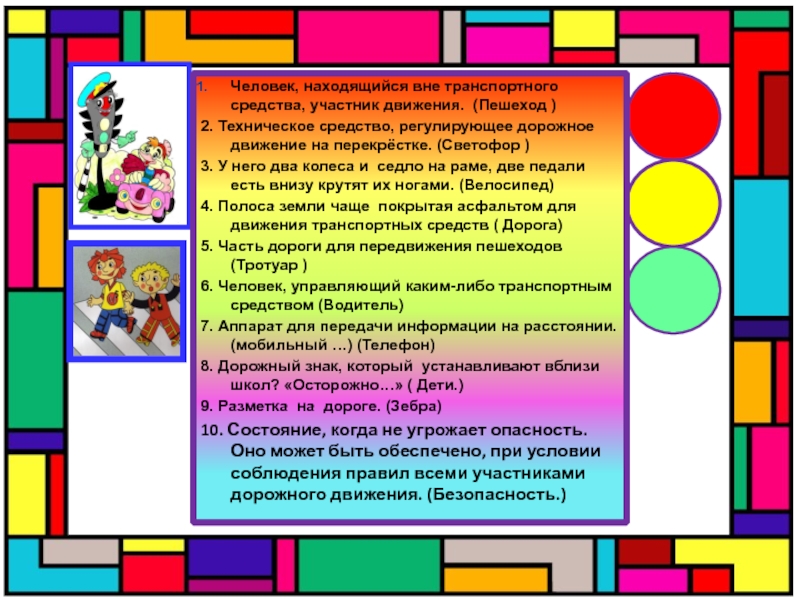 10. Состояние, когда не угрожает опасность. Оно может быть обеспечено, при условии соблюдения правил всеми участниками дорожного движения. (Безопасность.)