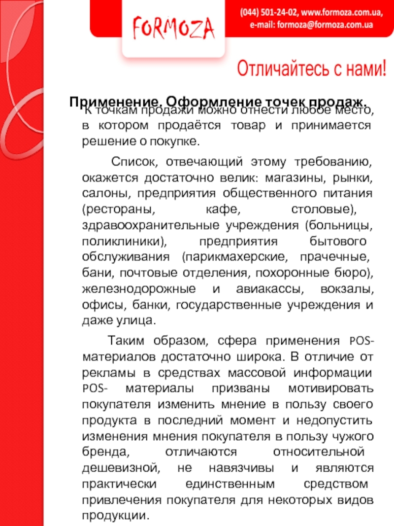 Таким образом, сфера применения POS-материалов достаточно широка. В отличие от рекламы в средствах массовой информации POS- материалы призваны мотивировать покупателя изменить мнение в пользу своего продукта в последний момент и недопустить изменения мнения покупателя в пользу чужого бренда, отличаются относительной дешевизной, не навязчивы и являются практически единственным средством привлечения покупателя для некоторых видов продукции.