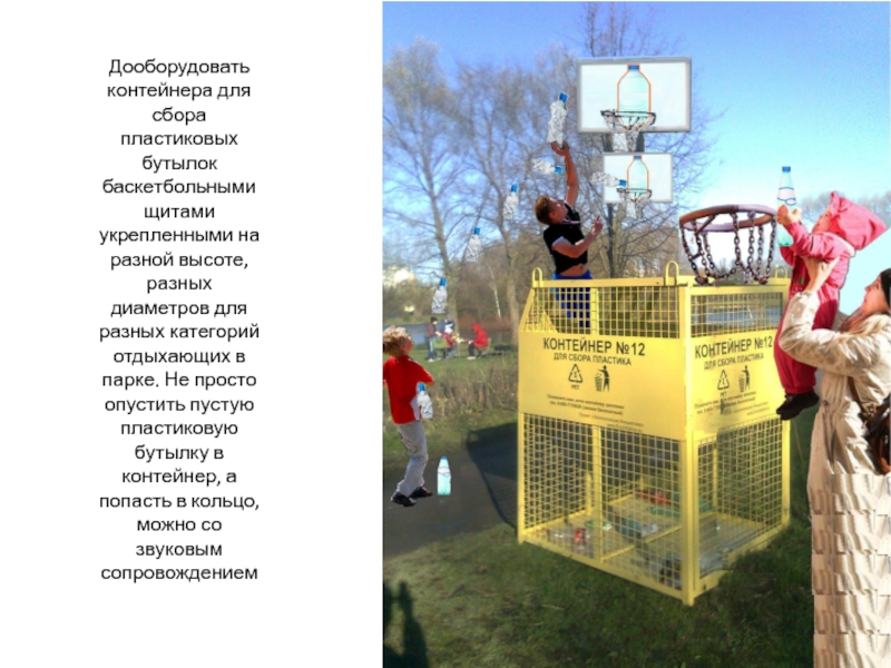 Слайд 9Дооборудовать контейнера для сбора пластиковых бутылок баскетбольными щитами укрепленными на разной