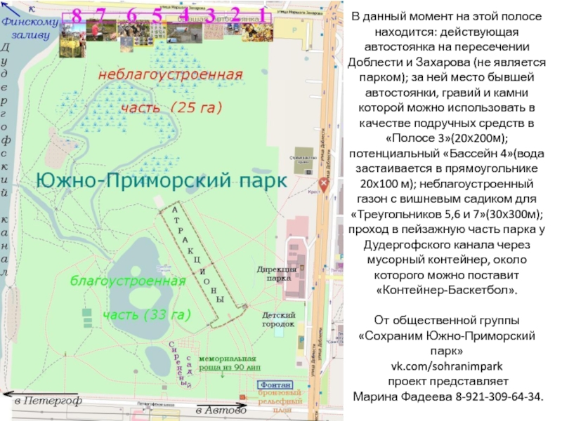 быстрейшим, экологически выгодным и малозатратным способом сделать доступной и привлекательной неблагоустроенную часть 3 очереди Южно-Приморского парка. И начинать мы хотим с полосы (6-8 га) являющейся северной границей парка и социального жилого квартала №20 по Захарова. Эта полоса визуально просматривается из окон высотных домов через Захарова, где получили жилье ветераны войны и блокадники, которые могли бы из окон наблюдать за действиями отдыхающих, особенно детей. Полоса максимально доступна для прохода и проезда инвалидов, которые могут участвовать по всех «аттракционах» полосы.
