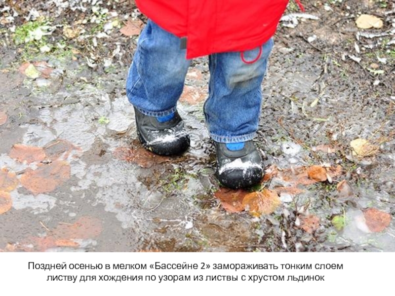 Слайд 3Поздней осенью в мелком «Бассейне 2» замораживать тонким слоем листву для