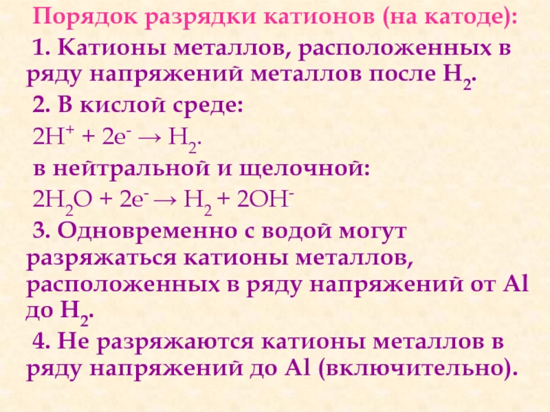3. Одновременно с водой могут разряжаться катионы металлов, расположенных в ряду напряжений от Al до H2.
