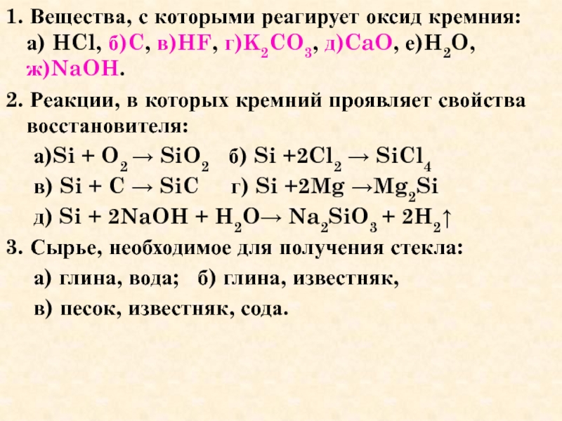 Слайд 161. Вещества, с которыми реагирует оксид кремния: а) HCl, б)C,