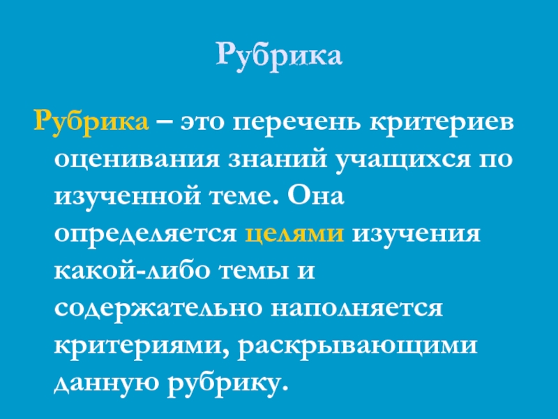 Она определяется целями изучения какой-либо темы и содержательно наполняется критериями, раскрывающими данную рубрику.