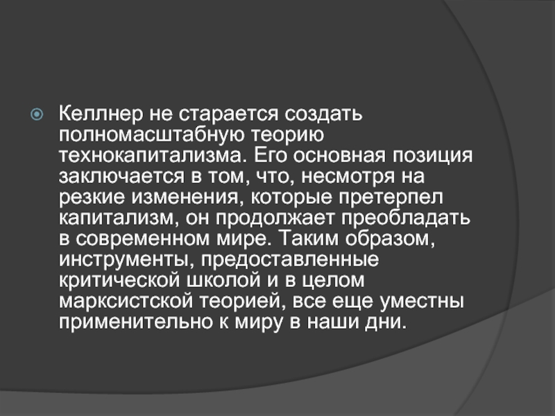 Келлнер не старается создать полномасштабную теорию технокапитализма. Его основная позиция заключается