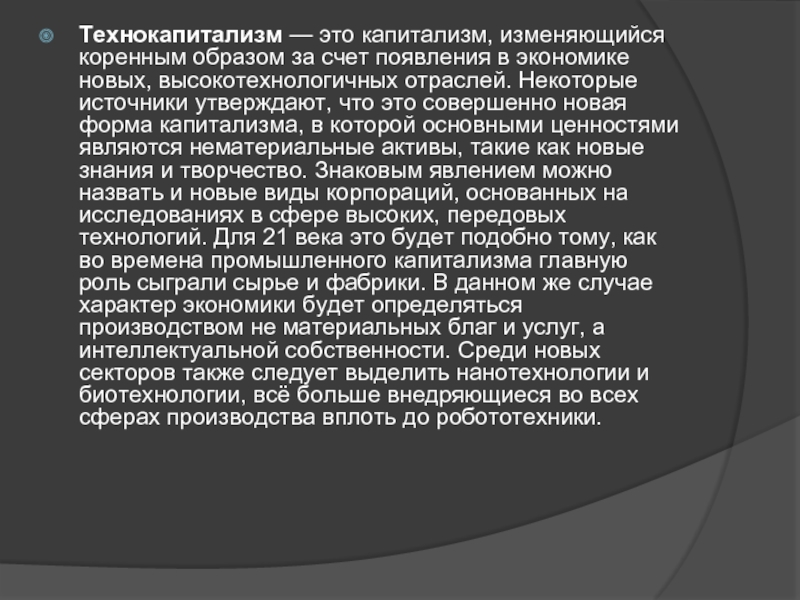 высокотехнологичных отраслей. Некоторые источники утверждают, что это совершенно новая форма капитализма, в которой основными ценностями являются нематериальные активы, такие как новые знания и творчество. Знаковым явлением можно назвать и новые виды корпораций, основанных на исследованиях в сфере высоких, передовых технологий. Для 21 века это будет подобно тому, как во времена промышленного капитализма главную роль сыграли сырье и фабрики. В данном же случае характер экономики будет определяться производством не материальных благ и услуг, а интеллектуальной собственности. Среди новых секторов также следует выделить нанотехнологии и биотехнологии, всё больше внедряющиеся во всех сферах производства вплоть до робототехники.