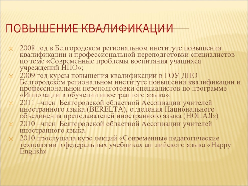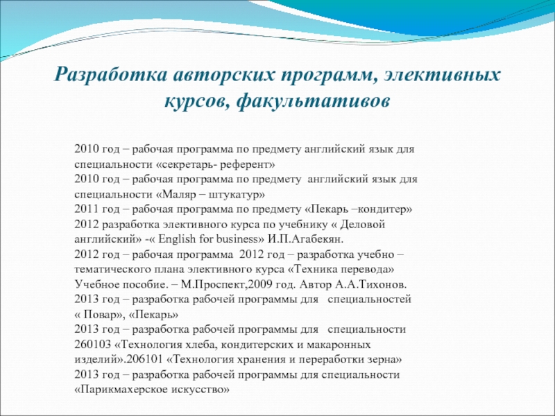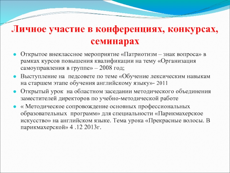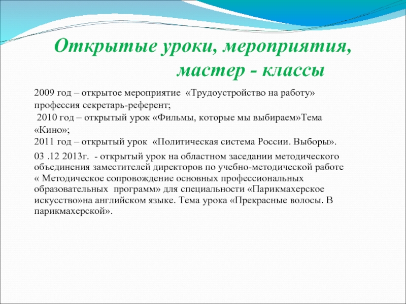 03 .12 2013г. - открытый урок на областном заседании методического объединения заместителей директоров по учебно-методической работе « Методическое сопровождение основных профессиональных образовательных программ» для специальности «Парикмахерское искусство»на английском языке. Тема урока «Прекрасные волосы. В парикмахерской».