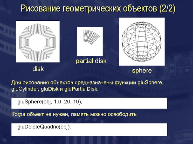 Функции для рисования базовых геометрических объектов: сферы, цилиндра, круга и сектора круга.