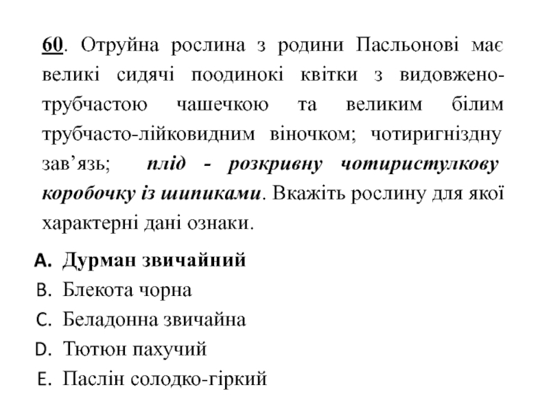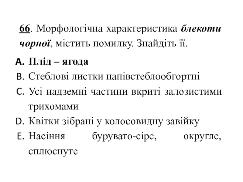 Слайд 8766. Морфологічна характеристика блекоти чорної, містить помилку. Знайдіть її.