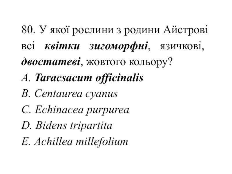 Слайд 10080. У якої рослини з родини Айстрові всі квітки зигоморфні, язичкові,