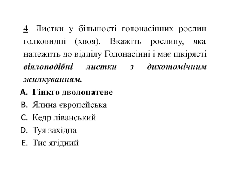 Слайд 164. Листки у більшості голонасінних рослин голковидні (хвоя). Вкажіть рослину, яка