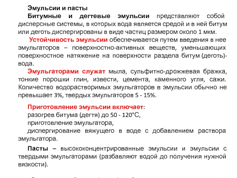 которых вода является средой и в ней битум или деготь диспергированы в виде частиц размером около 1 мкм.