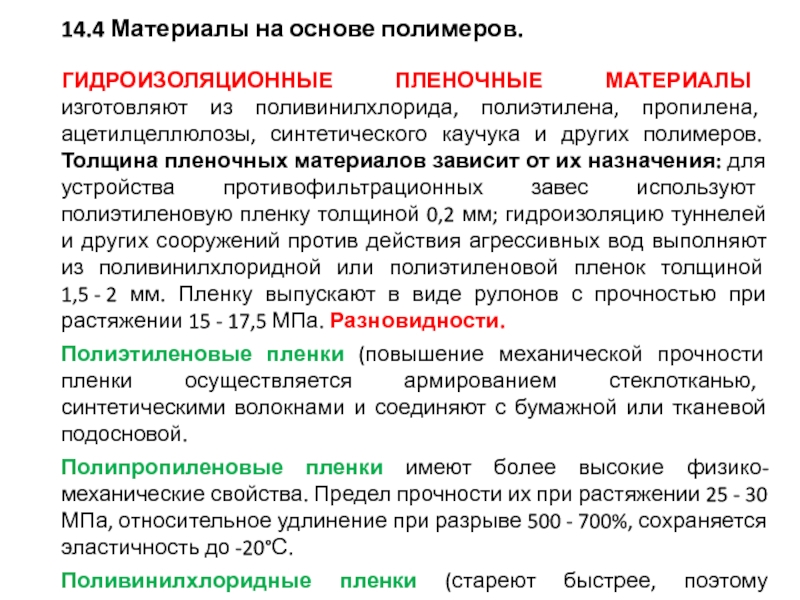 ГИДРОИЗОЛЯЦИОННЫЕ ПЛЕНОЧНЫЕ МАТЕРИАЛЫ изготовляют из поливинилхлорида, полиэтилена, пропилена,
