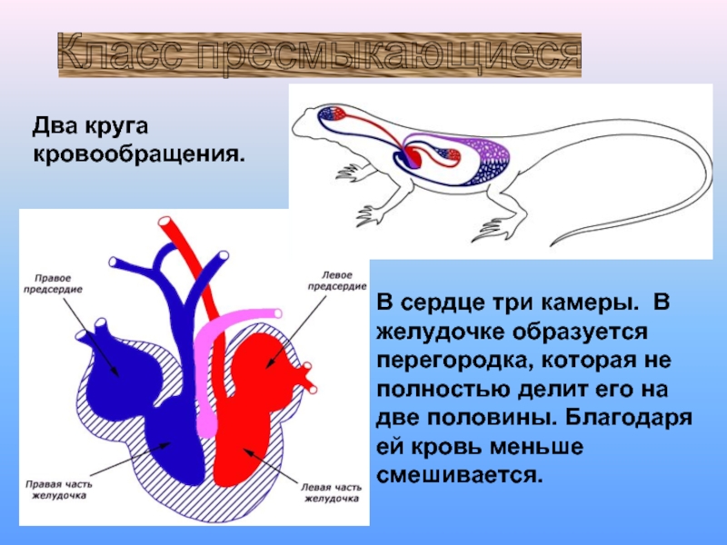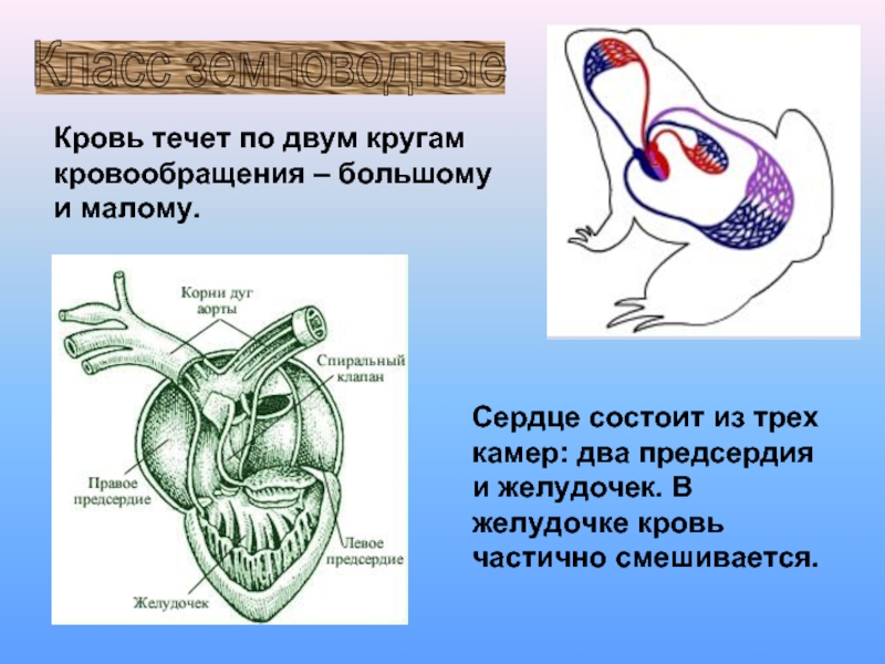 Сердце состоит из трех камер: два предсердия и желудочек. В желудочке кровь частично смешивается.