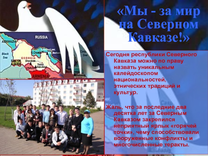 содействовать формированию активной гражданской и личностной позиции, выражающейся в стремлении к позитивным преобразованиям в обществе и мирному сосуществованию народов Северного Кавказа.