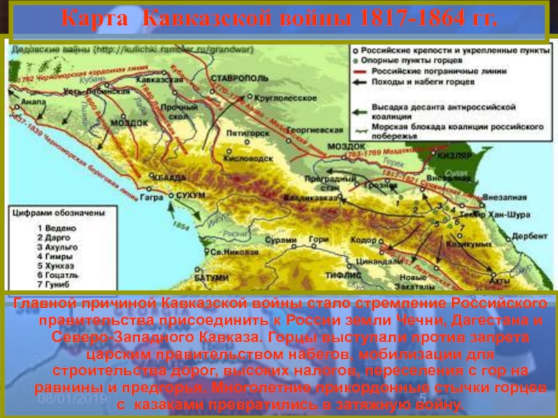 земли Чечни, Дагестана и Северо-Западного Кавказа. Горцы выступали против запрета царским правительством набегов, мобилизации для строительства дорог, высоких налогов, переселения с гор на равнины и предгорья. Многолетние прикордонные стычки горцев с казаками превратились в затяжную войну.