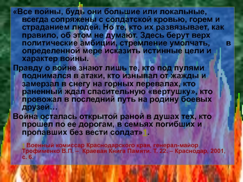 кровью, горем и страданием людей. Но те, кто их развязывает, как правило, об этом не думают. Здесь берут верх политические амбиции, стремление умолчать, в определенной мере исказить истинные цели и характер войны.