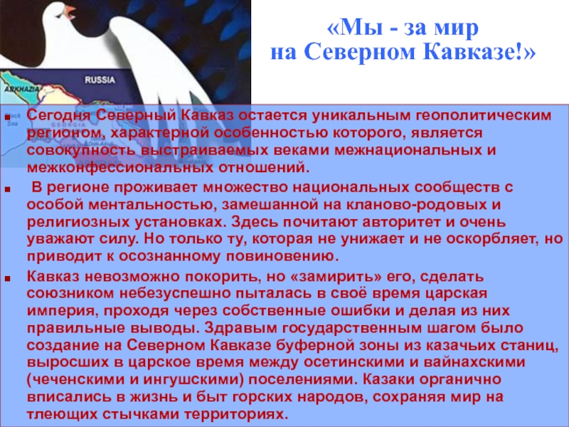 Сегодня Северный Кавказ остается уникальным геополитическим регионом, характерной особенностью которого, является совокупность выстраиваемых веками межнациональных и межконфессиональных отношений.