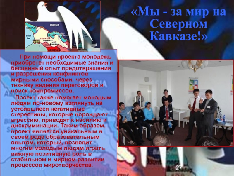 При помощи проекта молодежь приобретет необходимые знания и бесценный опыт предотвращения и разрешения конфликтов мирными способами, через технику ведения переговоров и поиск компромиссов.