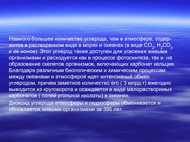 в растворенном виде в морях и океанах (в виде СО2, Н2СО3 и ее ионов). Этот углерод также доступен для усвоения живыми организмами и расходуется как в процессе фотосинтеза, так и на образование скелетов организмов, включающих карбонат кальция. Благодаря различным биологическим и химическим процессам между океанами и атмосферой идет интенсивный обмен углеродом, причем заметное количество его ( 3 млрд.т) ежегодно выводится из круговорота и осаждается в виде малорастворимых карбонатов ( солей угольной кислоты) в океанах.