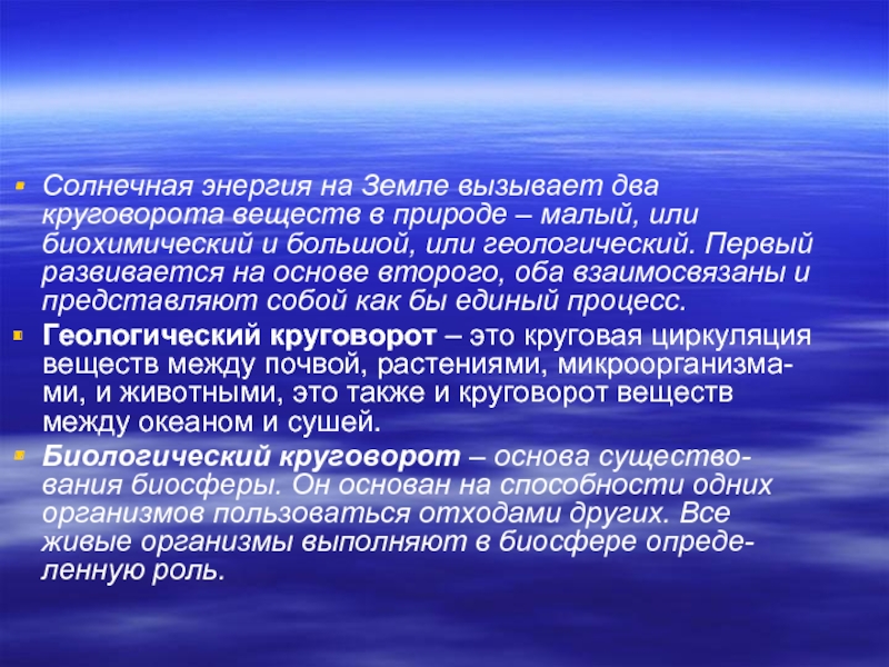 Геологический круговорот – это круговая циркуляция веществ между почвой, растениями, микроорганизма-ми, и животными, это также и круговорот веществ между океаном и сушей.
