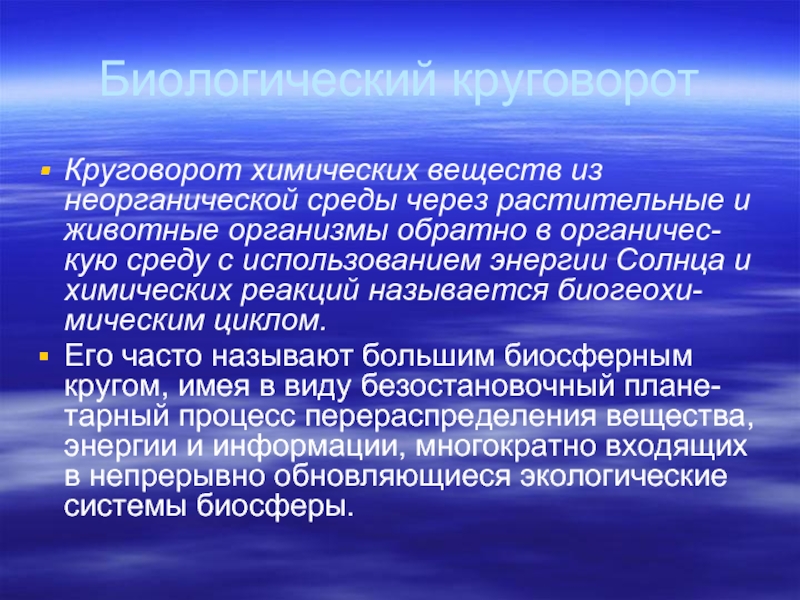 Его часто называют большим биосферным кругом, имея в виду безостановочный плане-тарный процесс перераспределения вещества, энергии и информации, многократно входящих в непрерывно обновляющиеся экологические системы биосферы.
