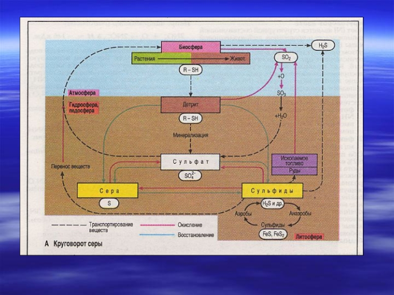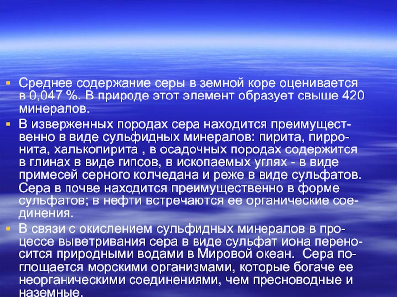 В связи с окислением сульфидных минералов в про-цессе выветривания сера в виде сульфат иона перено-сится природными водами в Мировой океан. Сера по-глощается морскими организмами, которые богаче ее неорганическими соединениями, чем пресноводные и наземные.